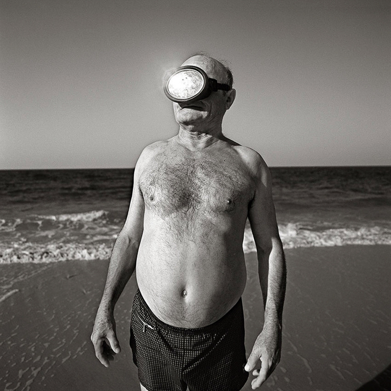 Hay juegos, ironía, colisiones de volúmenes, detalles mordaces, delicioso fisgoneo de parejas en trámite del cortejo, amorosos abrazos sentimentales a pie de orilla, abstracciones realistas –ese pie sobre un enorme flotador negro que parece descansar sobre un marea acuosa; un dedo que irrumpe en el encuadre como queriendo penetrar la oreja de un señor cuyo rostro en primer plano a la derecha vemos incompleto: es decir, dos fragmentos de una realidad que se nos da absurda e incompleta- imágenes de una soledad abrumadora pues la playa también es ese espacio en el que uno puede disolverse en el vacío de la inmensidad del agua, tirabuzones, anómalos antebrazos escayolados emergiendo del agua, saltos de chiquillos que componen borrosos y relampagueantes desequilibrios de volúmenes en el agua, otoñales y redondas crasitudes de la carne que abrigan el refugio de los nietos… Frente al estatismo conceptual de un Siquier, el dinamismo interior de las imágenes de Díaz Burgos, quien leal al motor humanista de su trabajo, y a su placer por el género, no puede evitar concluir “Historias de playa” con una serie de retratos de bañistas porticados por el célebre del señor de las enormes gafas de buceo incrustadas en el rostro que, incendidas por el reflejo del Sol, parecen iluminadas como si fueran el gigantesco y resplandeciente ojo de un cíclope fantástico. La forma transparente que tiene Díaz Burgos de excavar el transfondo irreal que toda realidad esconde.