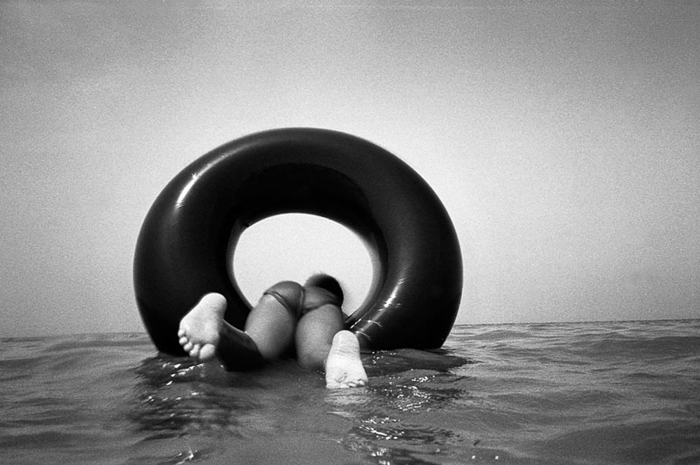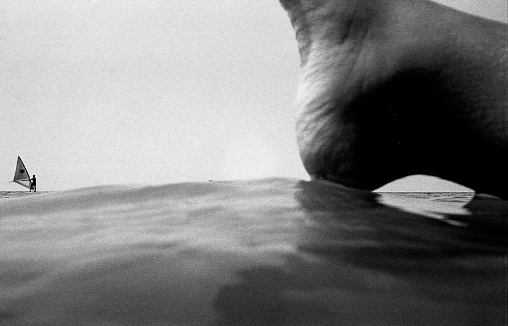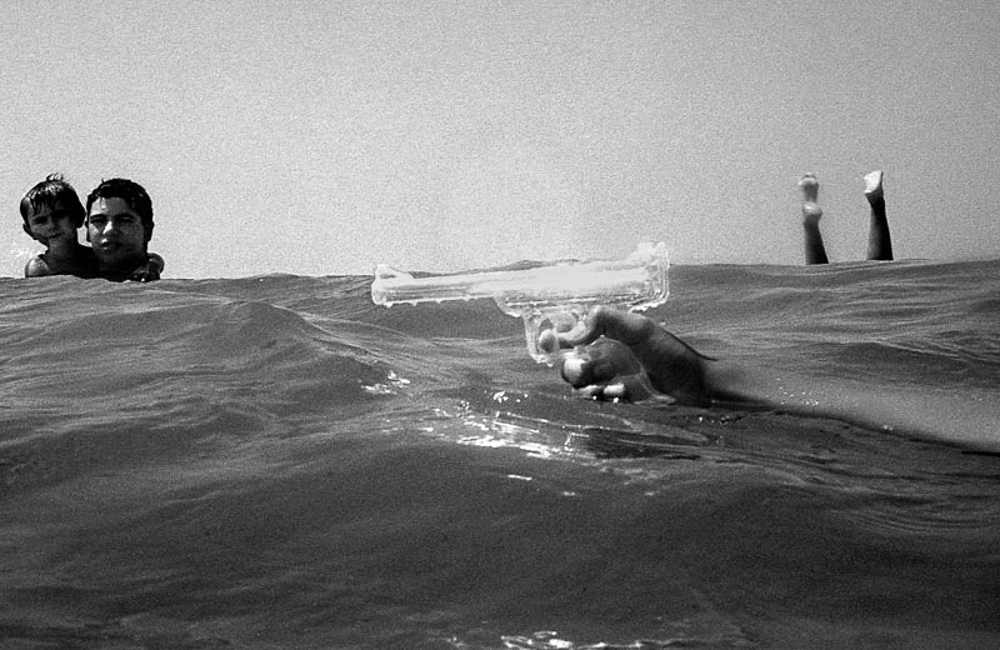 Pero el afán sociológico que suele acompañar el trabajo de Díaz Burgos está penetrado por la perspicacia, aquí, doblemente brillante pues Juan Manuel, obligado por la discreción y el movimiento oscilante de las olas (porque él fotografía a un palmo de las brazadas de sus nadadores) dispara rápidamente alzando la cámara “a ojo” o como se suele decir “a ciegas”, haciéndolo con una visión formalista que nos regala complejas composiciones de una extrañeza surrealista. Así, la maravillosa foto de la pistola; la hipnótica de la masa de un tobillo posado sobre el agua en primer plano que compone otro surreal juego de volúmenes con la diminuta figura de un surfista equilibrando el plano muy al fondo o la de esa pareja cuyas piernas, descansando la una sobre la otra, yacen amorosas al borde de la orilla vigilados por la irónica cabeza de un fisgón flotador de pato…