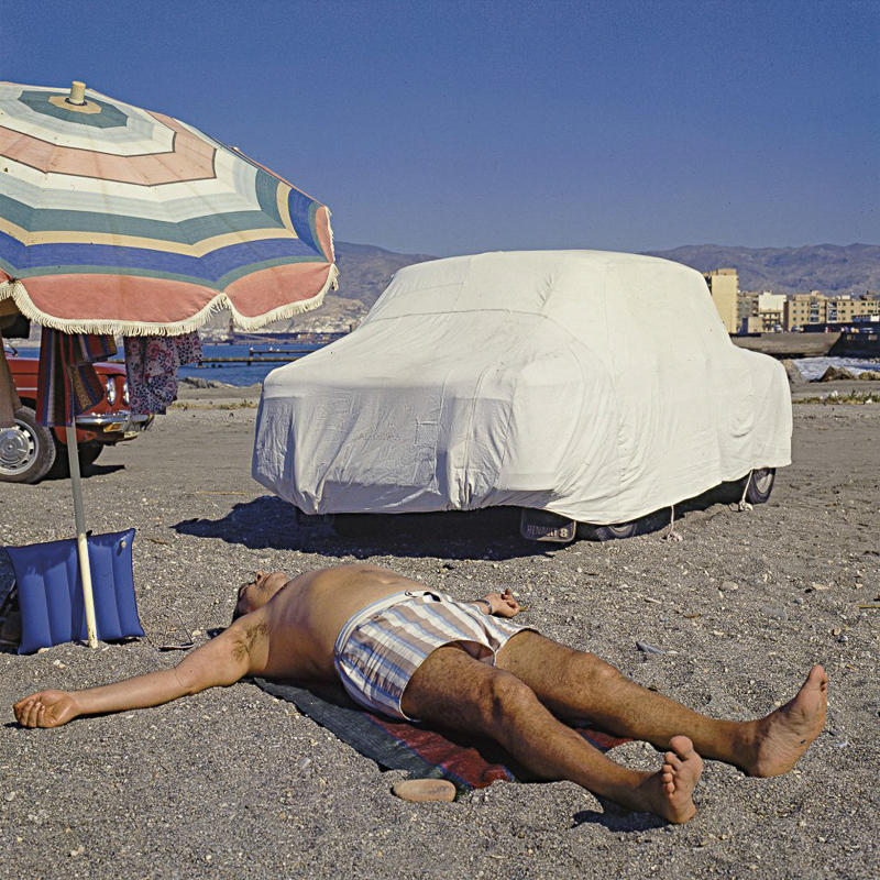 A primeros de los 70, Carlos Pérez Siquier (Almería, 1930), el mismo que ya había documentado en riguroso blanco y negro los miserables tiempos de silencio del franquismo en la marginalidad gitana de La Chanca, abraza definitivamente el color -en el que, hacia el 63, ya había buceado sin bombona para registrar las vivas geometrías de las casucas de La Chanca y el vivísimo cromatismo de sus calles y sus desvencijadas fachadas e interiores- en otro de esos gestos de la rebeldía que han signado su vida y su trabajo. Cuando todos los cardenales, desde Cartier-Bresson o Walker Evans a Paul Strand, evangelizaban contra el uso del color estigmatizándolo como un pecado de alta traición y vulgaridad, a Carlos Pérez-Siquier se le ocurre irse a un espacio sin demasiado prestigio cultural –la playa, ese reducto del relax, el mal gusto y la trivialidad que solo será reivindicado por la contemporaneidad- cargando el sacrosanto medio formato con la herejía de una película de chirriantes colorines. Doble mortal.