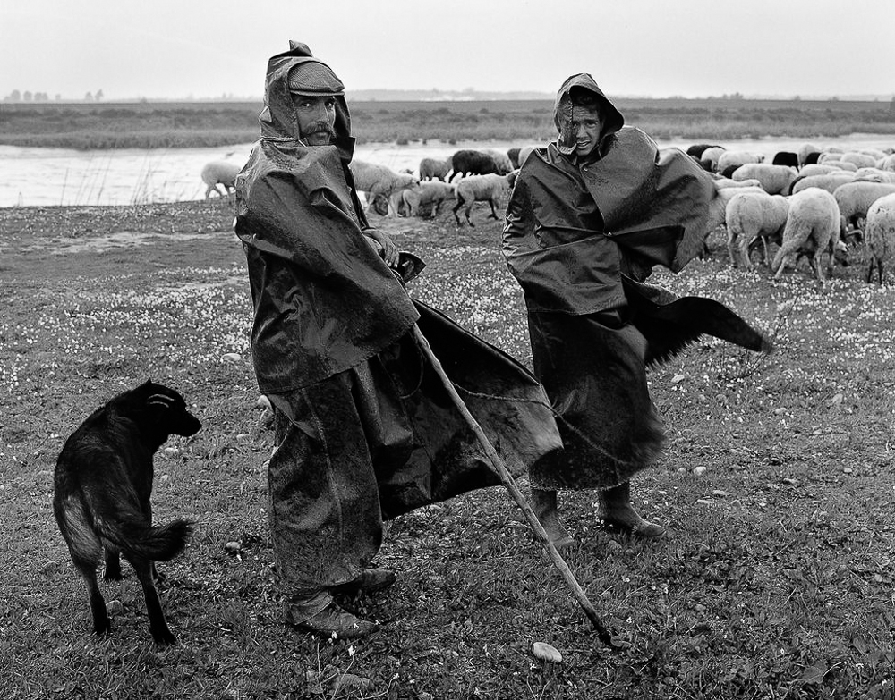 Es paradójico: trabajando ya, como él trabajaba, en el servicio de documentación fotográfica del proyecto innovador y futurista de la Expo 92, Atín Aya sintió la llamada del ritual de las matanzas en familia, de los espantapájaros alzándose inquietantes junto a las alambradas, de los hombres que caminan solitariamente sobre un horizonte de dunas cerca del Palacio de Doñana, de los pastores que recorrían con el ganado la ribera del Guadaira enfundados en sus recios capotes al pairo de la lluvia, de los hombres cetrinos y curtidos que lo miran fijamente a cámara con esa “soledad altiva”, de la que hablaba Luis Cernuda, citado por Lola Garrido… Gentes que parecían vivir en una realidad o un tiempo paralelo al del presente contemporáneo de Sevilla y que encuentran en Atín Aya a un inesperado etnógrafo cómplice de su extrañamiento interesado en preservar los últimos vestigios de su paso por una Andalucía que -y en una equivalencia visual de la Andalucía literaria de Caballero Bonald- ante la cámara de Atín, se acaba. En cierto modo, Atín Aya tiene un algo de fotógrafo sepulturero, postrímero, notarial y conclusivo.
