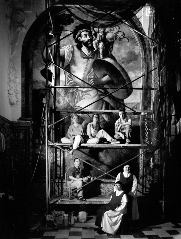 Tampoco los retratos de Atín, siendo sus personajes muchas veces arquetipos de alguna tipología o de algún gremio, no sugieren la objetualización o catalogación de otras propuestas, tipo Sander. Lo que vemos son figuras individuales, que jamás pierden su propia personalidad, insertadas en su medio, camufladas con él, llenando el hueco que clamaría sin ellos, concediéndole sentido a un decorado ya dispuesto. Pero, en general, salvando con un gesto del carácter su condición de figuras únicas: como su peluquero. Si en las tomas individuales ya brilla lo suyo, es en los grupos –la familia durante el rito de la matanza visto como una reactualización doméstica de la Última Santa Cena; la reunión de trabajadores dispuestos en la gañanía de El Chorreadero Viejo o la de los restauradores con dos monjas ante el retablo de la capilla de San Cristóbal- donde Atín Aya confirma una maestría excepcional en la distribución del aire y los volúmenes, en el manejo de la espacialidad y en la elevación de la toma a un territorio que, como observó alguien, sobre el que flota un “ambiente basilical” conectado, para mi, con alguna forma laica de la religiosidad, por sobria y ascética que fuera, como esa orden de la iglesia de La Caridad de Sevilla, el templo más severamente mortuorio de Sevilla, en la que Atín Aya ingresó tras la impresión que le produjo el ceremonial del entierro de su padre.