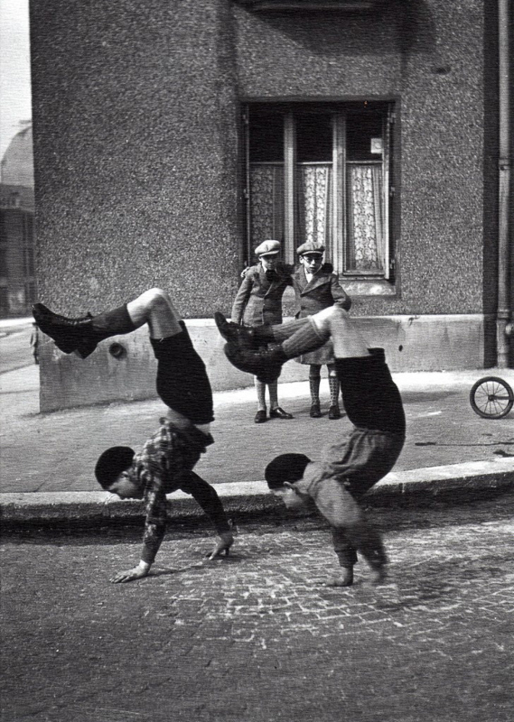 Sí. Doisneau se crece mucho cuando -como trato de rescatarlo en la mayoría de las imágenes que he seleccionado- se «abre» y deja de pretender contarme un cuento cerrado. Pero aún así, y en una visión general de su obra, me faltan las sombras de la cara amarga de la vida, esa que cuando le aparecía en el visor, Doisneau solía esquivar con una pirueta que lo redirigía hacia el humor. Para los que buscamos cierto enigma y complejidad en la fotografía, algo situado más allá de la obviedad realista, la de Doisneau se nos antoja una cámara demasiado clara, legible y transparente. En un momento -finales de los 50- en el que la fotografía ya empieza a tornarse, como el mundo, compleja y oscura (Robert Frank), Doisneau todavía sigue buscando deliberadamente imágenes compositivamente ordinarias y corrientes que él trata de organizar aún de una forma estética aún bien simple recurriendo a la forma de las letras A, V, L y O que son, decía él de su suerte de básico alfabeto visual, las composiciones con las que el público se identifica de manera inconsciente. Ahora bien: esa estrategia no fue inconsciente. Doisneau simplifica su discurso visual a sabiendas de que así ganará a un público analfabeto visualmente. «Pensé: «Seré amable con ellos, ya que estoy dirigiéndome a personas discapacitadas». Si Robert Frank, como tantos otros innovadores que hubiesen tomado al público por discapacitado, se hubiera acogido a la misma estrategia reductora, hoy la Fotografía andaría todavía anclada en su Medievo.
