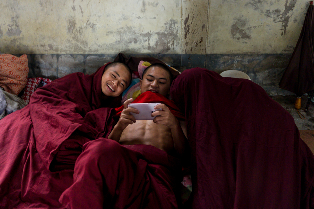 Jóvenes monjes contemplan la pantalla de un teléfono móvil en un monasterio budista de Myammar